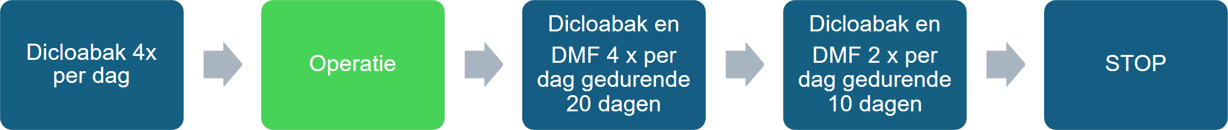 • Dicloabak 4 x per dag te starten de dag voor de operatie gedurende 21 dagen, daarna nog 2 x per dag gedurende 10 dagen.