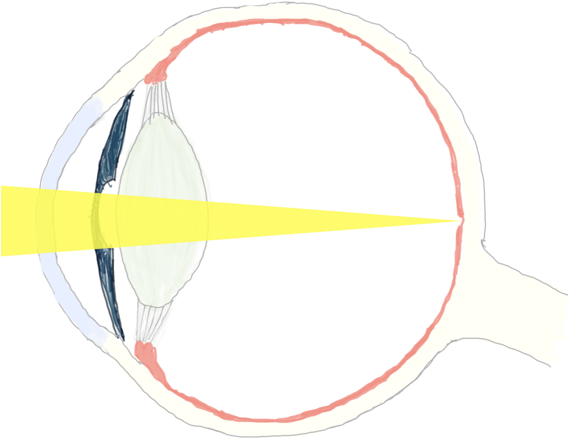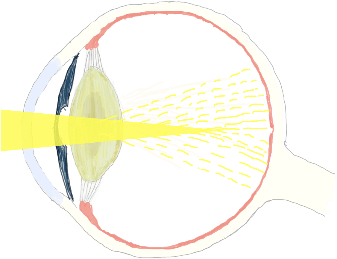 Figuur 1: Doorsnede van een oog met A. heldere lens en beeld dat mooi op het netvlies wordt geprojecteerd en B. cataract (troebele lens) en een beeld dat verstrooid op het netvlies wordt geprojecteerd.
